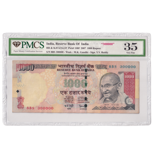 India 2007 1000 Rupees Sign Y.V.Reddy PMCS Certified 8BS 300000 Banknote