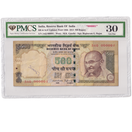India 2013 500 Rupees Sign Raghuram G.Rajan PMCS Certified 30 3AQ 000001 Banknote