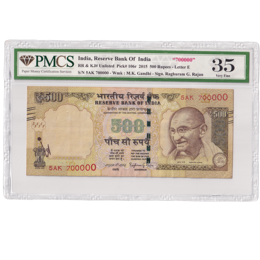 India 2015 500 Rupees Sign Raghuram G.Rajan PMCS Certified 35 5AK 700000 Banknote