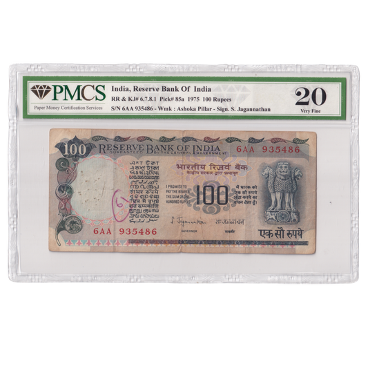 India 1975 100rs Sign S.Jagannathan PMCS Certified 20 6AA 935486 Banknote