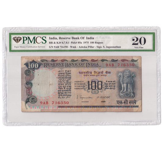India 1975 100 Rupees Sign S.Jagannathan PMCS Certified 20 9AB 716350 Banknote