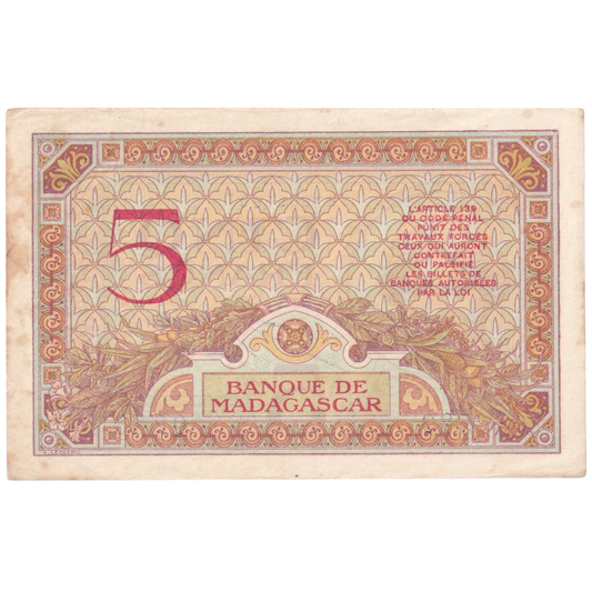 MADAGASCAR 1926-1947 5 FRANCS VF 589 Q.2703 Banknote