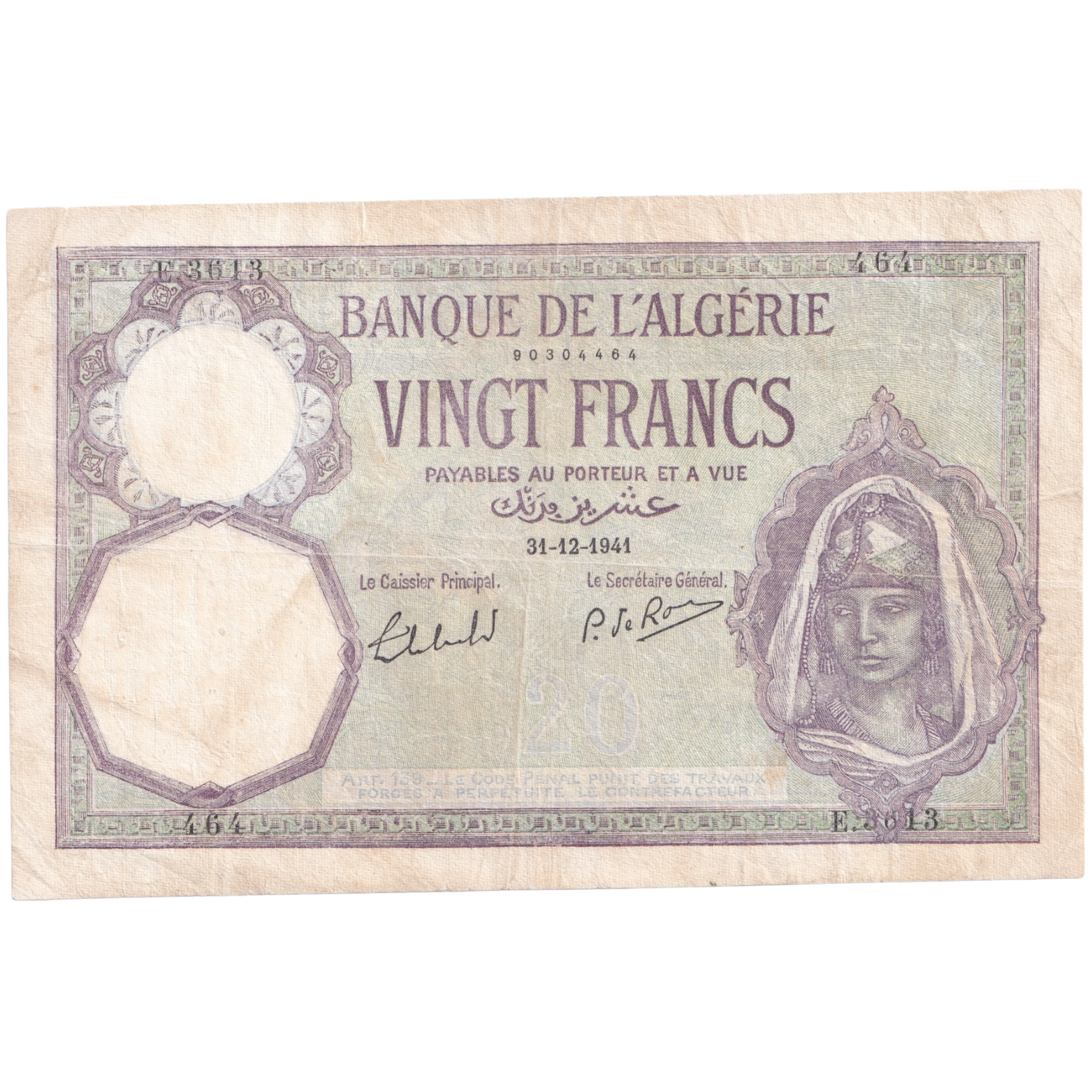 ALGERIA 1941 20 FRANCS VF 464 E.3613 Banknote