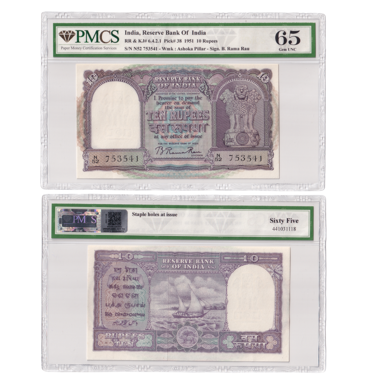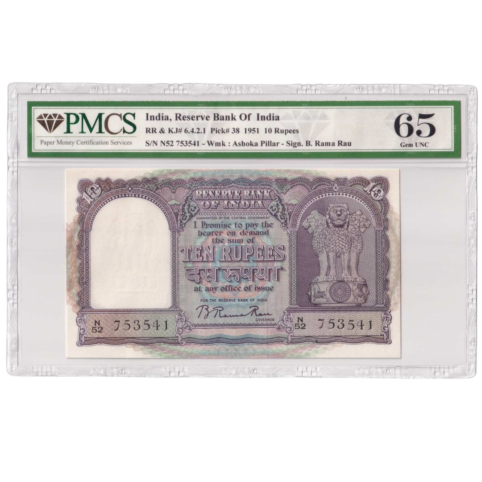 India 1951 Ten RUPEES B Rama Rau Signature PMCS Certified AUNC 50 Serial N52 753541 Banknote.