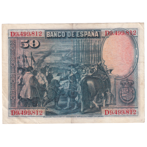 Spain 1928 50 Pesetas VF D9,499,812 Banknote